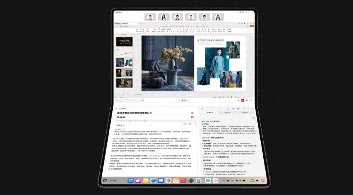 作为首款鸿蒙折叠电脑,它颠覆了传统笔记本的形态,而且提供多种独有手势交互体验。例如,用户只需通过简单的五指张开或捏合手势,即可在自由窗口、窗口最大化和瀑布屏三种窗口模式间无缝切换。折叠态下,用户只需简单使用三指手势即可将目标窗口从上屏移动到下屏。独特的隔空手势,仅需“一抓一放”,即可将电脑上的文件轻松甩给身旁的华为手机,数据流转超轻松。