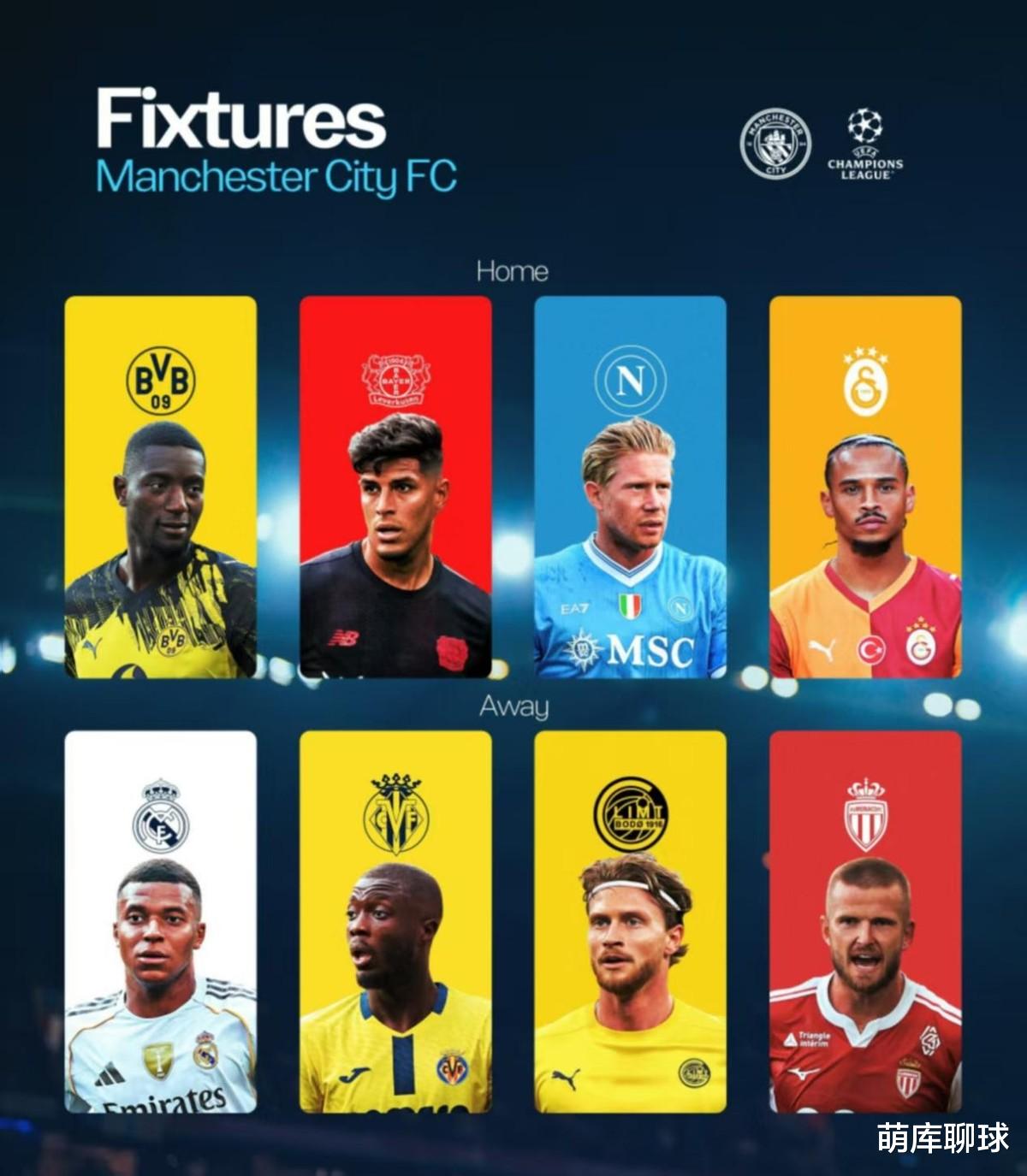曼城四个主场将分别面对多特蒙德、勒沃库森、那不勒斯和加拉塔萨雷,这四个对手对于曼城来说,都是曼城稍稍占据优势。客场方面前往西班牙面对皇马和比利亚雷亚尔,前往挪威面对博德闪耀。此外还有法甲球队摩纳哥。