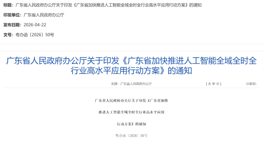 4月22日,广东省人民政府办公厅发布关于印发《广东省加快推进人工智能全域全时全行业高水平应用行动方案》的通知。