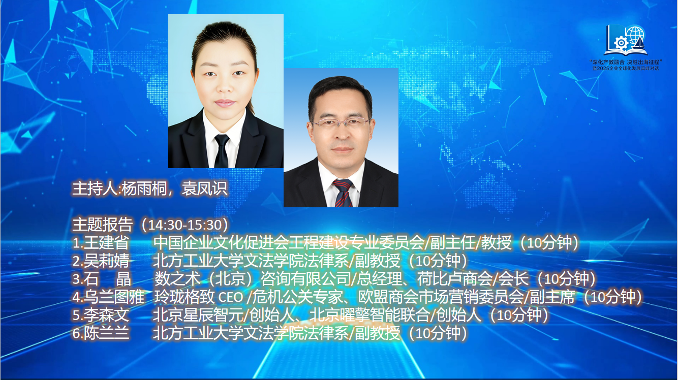 在全球化浪潮与中国经济高质量发展交汇之际,企业 “出海” 已从选择题变为必答题。为精准把握时代机遇、应对国际市场挑战,亟需政产学研多方携手,探索产教融合赋能企业出海的新模式、新路径。2025 年 11 月 5 日,由中国企业文化促进会工程建设专业委员会主办、北方工业大学文法学院承办、数之术(北京)咨询有限公司协办的 “深化产教融合 决胜出海征程” 暨 2025 企业全球化发展高峰对话,在北方工业大学文法学院顺利举办,产学研各界 60 余位领导出席活动。