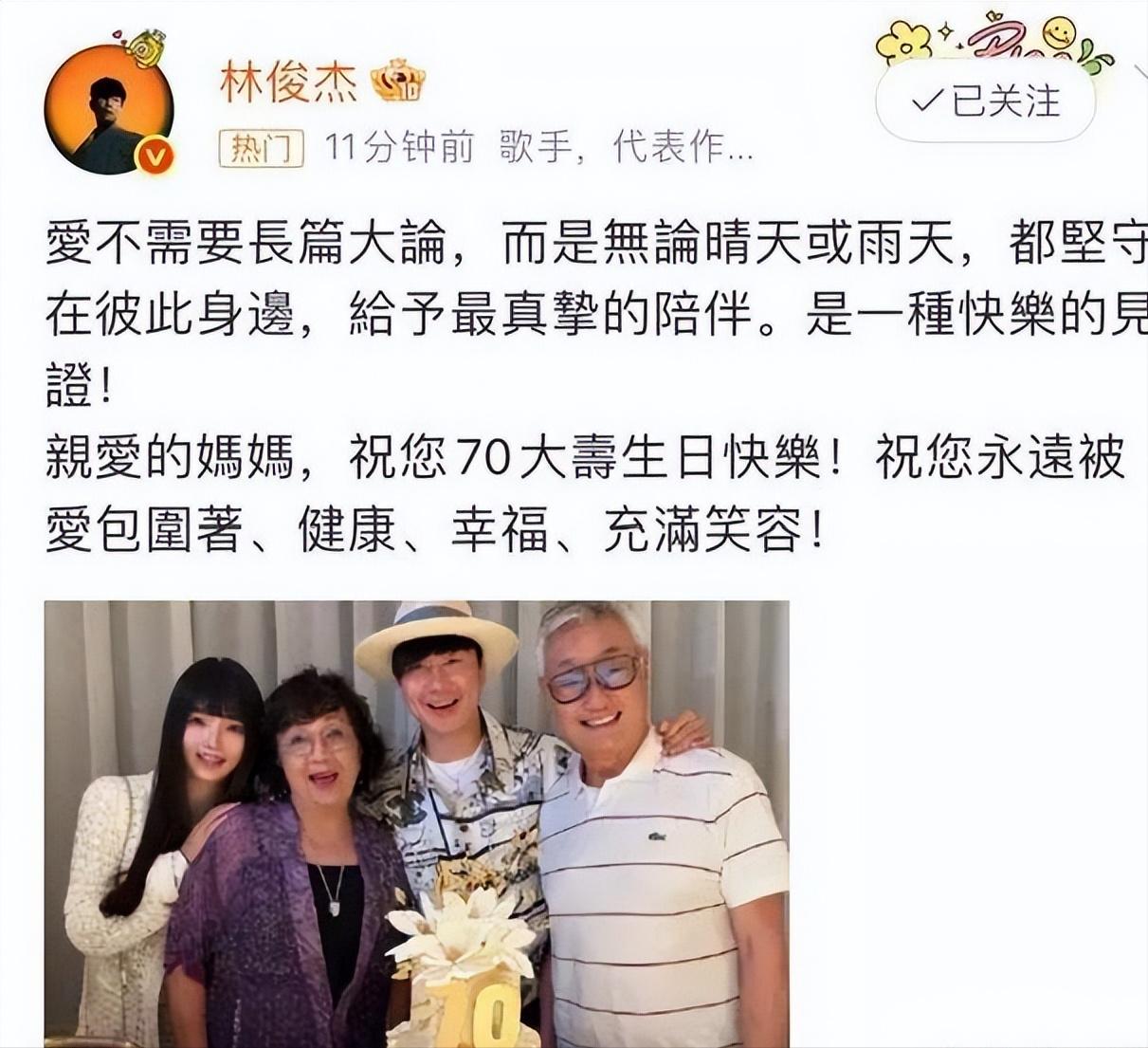 "爱不需要长篇大论,而是无论晴天或雨天,都坚守在彼此身边,给予最真挚的陪伴。" 林俊杰写下这句话时,或许想起了母亲为他熨烫演出服的无数个深夜,想起了年少时练歌房外母亲默默等候的身影。文字不长,却像他唱过的那些情歌一样,每个字都带着温度。后面那句 "亲爱的妈妈,祝您 70 大寿生日快乐!祝您永远被爱包围着、健康、幸福、充满笑容",简单直白的祝福里,藏着四十多年母子情深的浓缩。