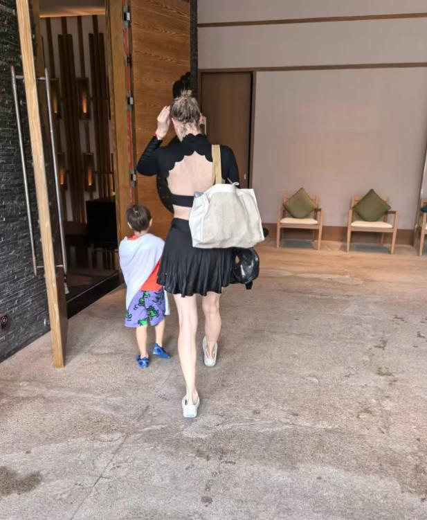 李白背影出镜,身穿黑色泳装扎着丸子头,细腰长腿一览无余,而且走路姿态也超级优雅,尽显千金气质。
