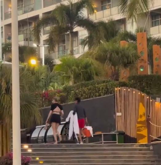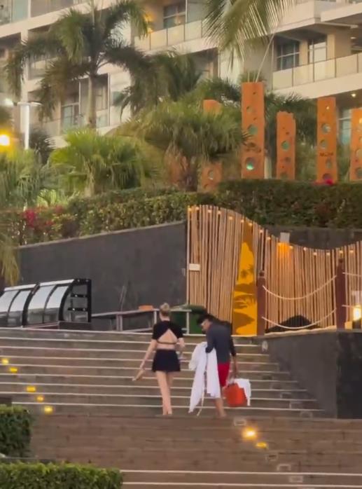 灰色泳衣加上红色短裤,穿的着实不帅气,不仅如此,撒贝宁还一手抱着睡衣一手拎着手提包,走路时还弓着背,怎么看怎么像李白卑微的小跟班。