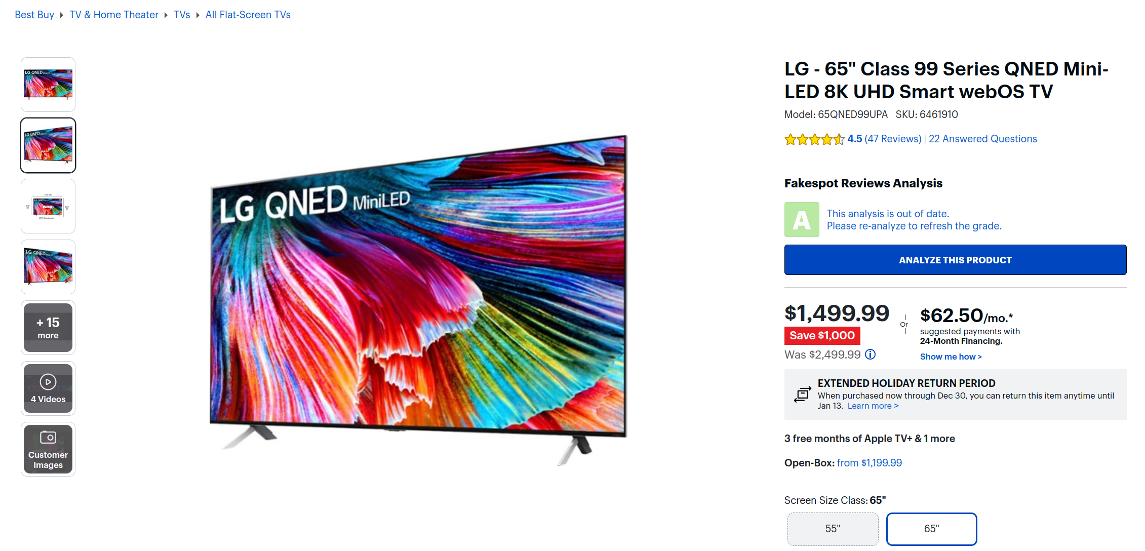 图 4 LG Nanocell 99 65 英寸 8K 电视在百思买仅售 $1500。