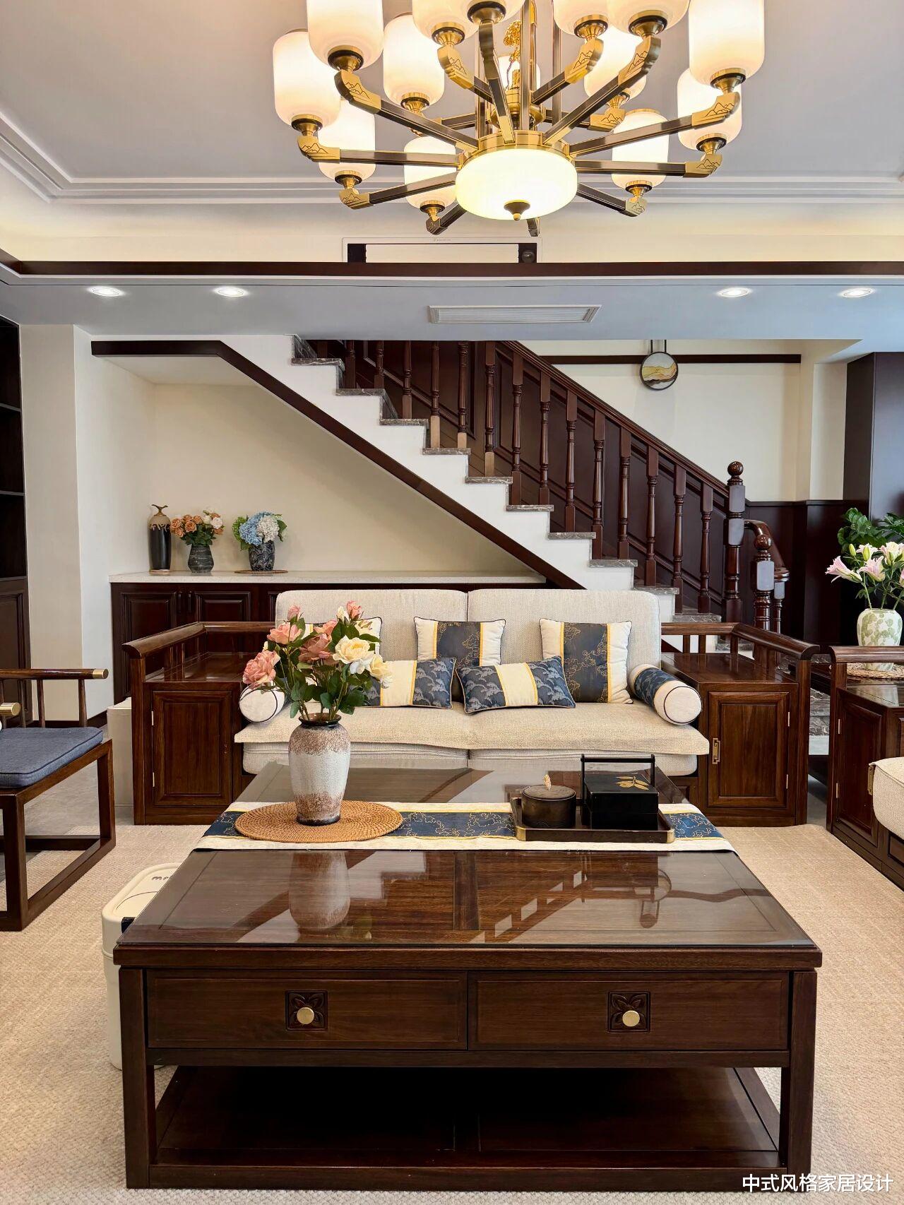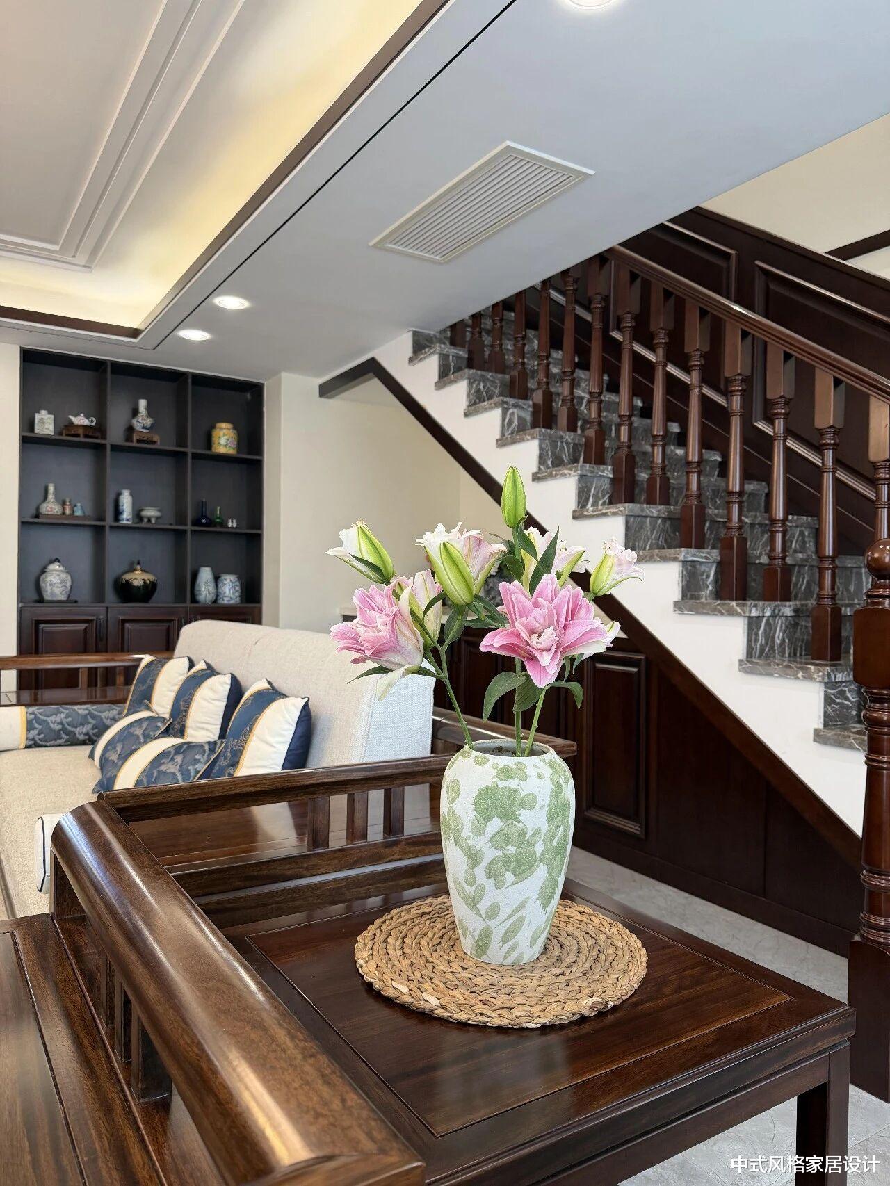 屋主的家是224平米的顶复结构,但许多人担心小户型(如150平米以下)是否适合新中式风格。答案是肯定的!关键在于确保户型通透、采光充足。新中式注重“借景”与“流动”,如果空间较小,可以通过开放式设计增强通透感,例如减少隔断、选用浅色调墙面和家具。屋主提到,她家没有沙发背景墙,而是利用楼梯下方打造地柜,既增加了收纳空间,又保持了视觉上的简洁。这种设计尤其适合小户型——多功能家具和隐藏式储物能最大化利用空间,避免杂乱。