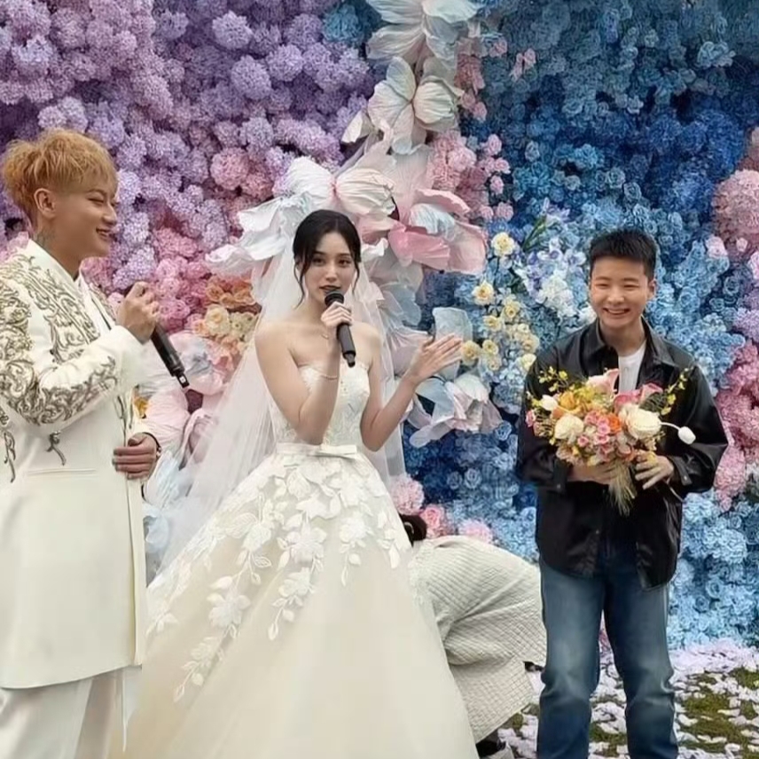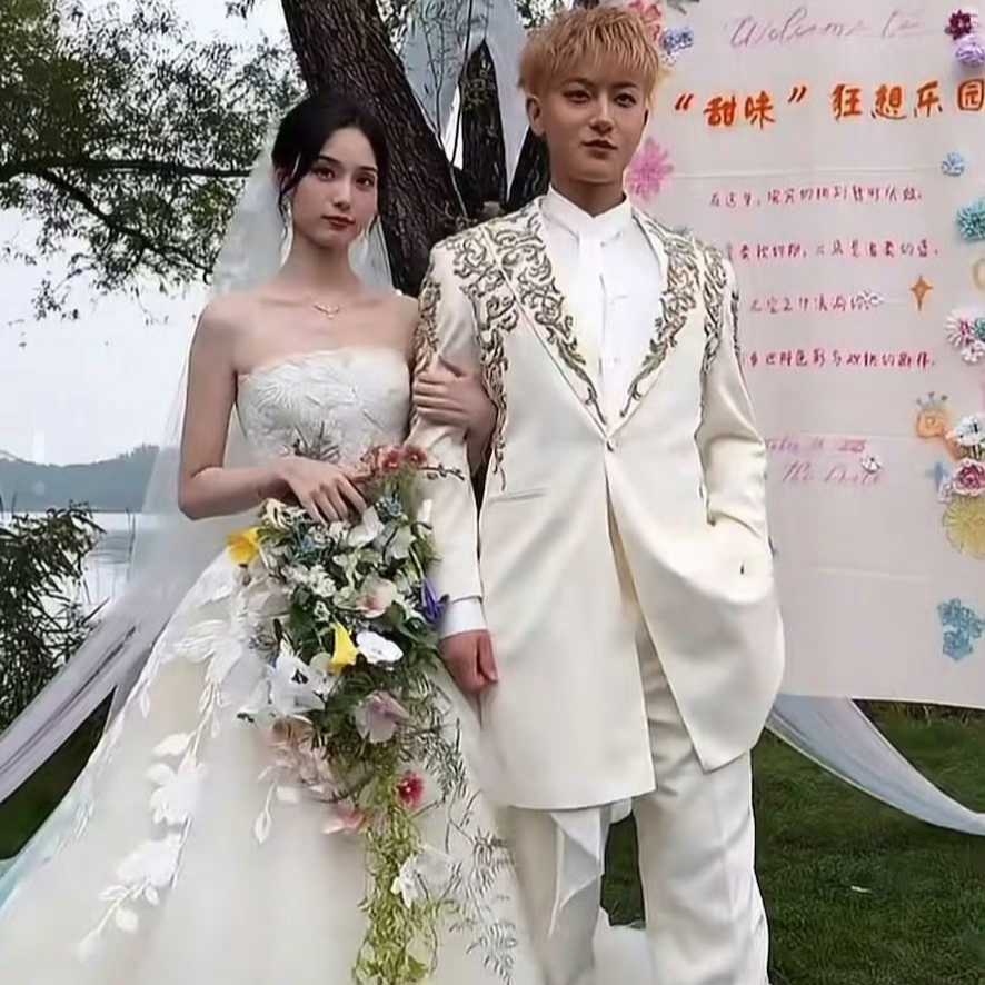 从曝光的现场图片可见,婚礼细节处处彰显新人的独特品味。徐艺洋身着两套风格各异的婚纱:一套是户外仪式时的抹胸大裙摆婚纱,裙身缀满花朵刺绣,头纱轻扬;另一套是晚宴时的简约高领长袖婚纱,典雅大方。黄子韬则以白色刺绣西装与经典黑色正装切换造型,尤其是白色西装上的精致花纹,与新娘的婚纱呼应,暗藏甜蜜细节。二人站在写有“欢迎来到‘甜味’狂想乐园”的鲜花展板前合影,仿佛将爱情故事融入了一场梦幻乐园之旅。