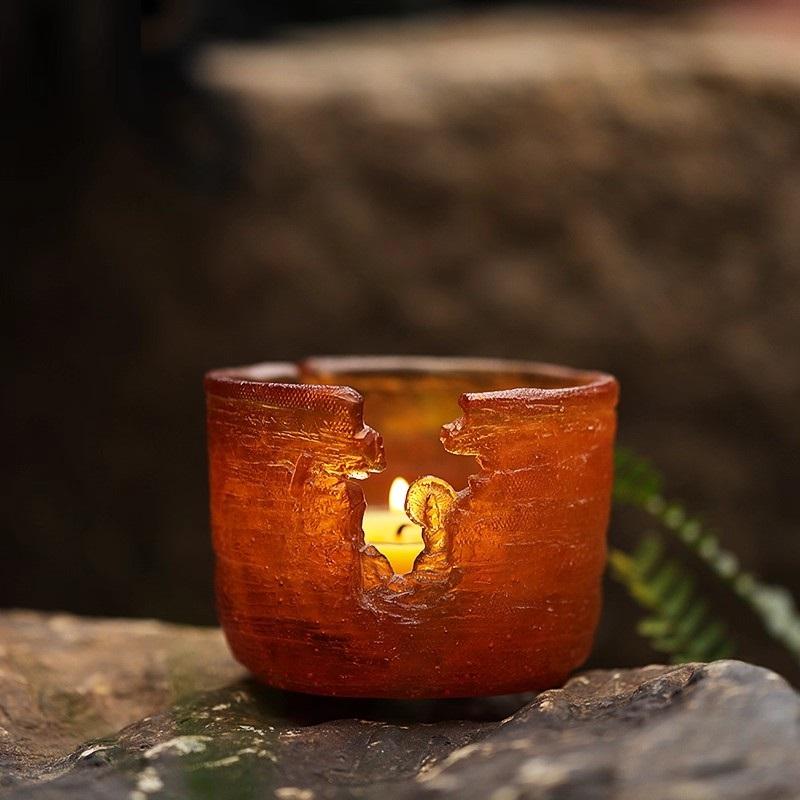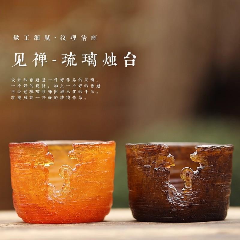 从材质上看,古法琉璃晶莹剔透,在光线的映照下,散发出温润而迷人的光泽。其内部似有云雾流动,又藏着星星点点的气泡,这些天然形成的纹理和气泡,就像是大自然赋予的独特印记,每一处都独一无二,为见禅烛台增添了几分神秘的色彩。