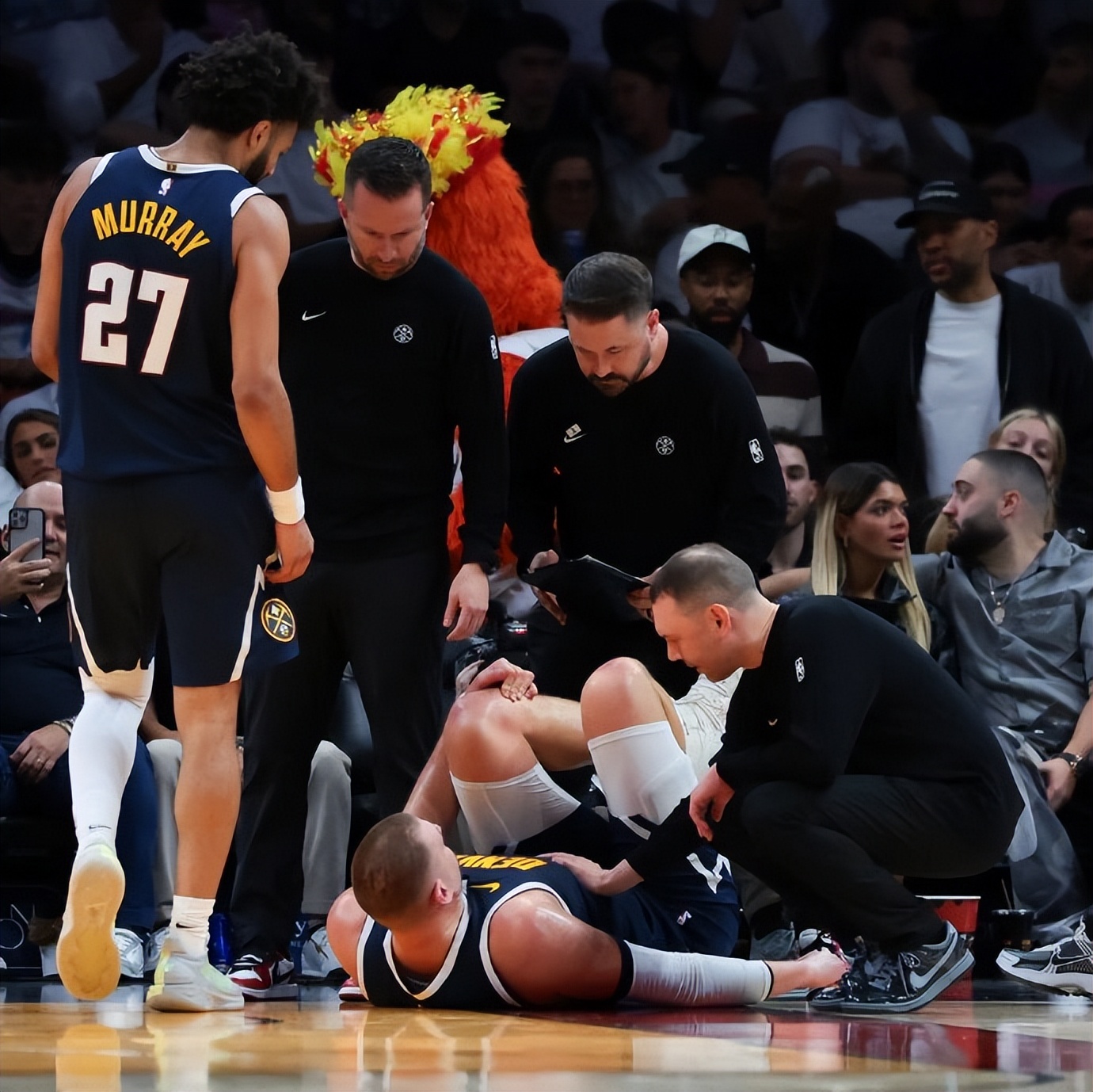 在对阵热火的比赛中,约基奇不幸被队友踩到脚,导致左膝过度伸展,提前退出了比赛。根据最新消息,约基奇的膝盖没有结构性的损伤,将在四周后重新评估伤情,这意味着约基奇将至少缺席一个月的时间。