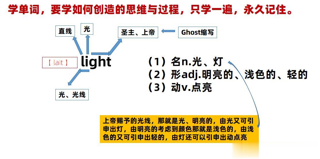 通过这个词大家会看到要想掌握这个词,我们需要学会“光light”,我们在引导孩子为什么西方古人将“光”写成“light”这样?你能从“light”中看到有关于光的表达吗?只要他能看到“light”中的“li”可能表示“光”,那我们就离培养出新时代牛顿不远了!然后大家给孩子看“light”的解说!