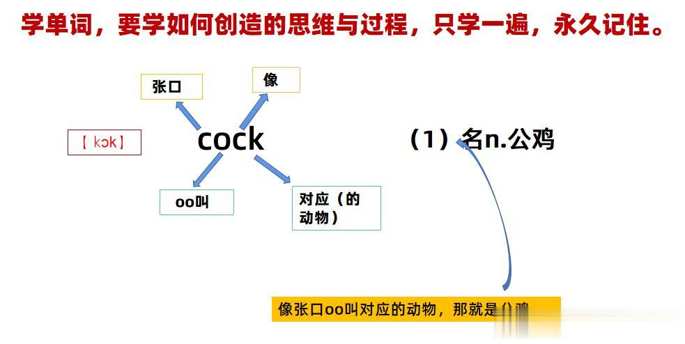 当然大家也可以给他看另外一个“公鸡”表达的单词“cock”,值得注意的是,“cock 公鸡”则描绘了“像张口oo叫对应的动物”这样一句话!,与“rooster”创造思维几乎相同!但书写不同!同时表达的意境也有一点差别!“rooster”主要表示“雄鸡”,而“cock ”表示“普通的公鸡”!