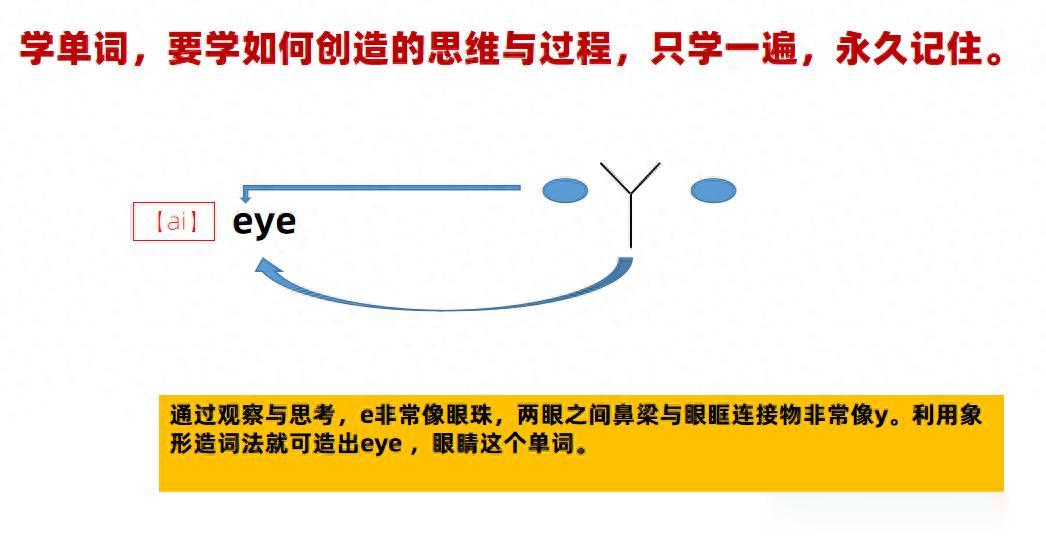 比如“eye眼睛”,东方是在象形字“目”的基础上,进一步描绘“眼”和“睛”,而西方直接将人类眼部跟前的特征利用字母描绘出来!大家认真阅读一下这个单词的解说。