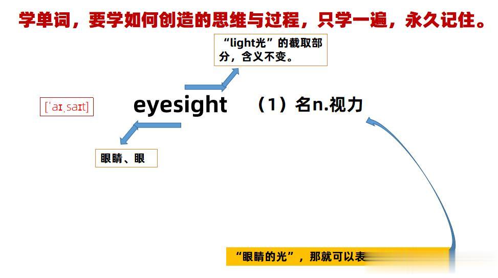 紧接着大家可以抛出“视力”西方古人如何表示的?问孩子会不会与“eye”有关系?只要孩子没见过“视力”对应的单词,通过思考后,他敢肯定的说,一定与“eye”有关系,那么我们培养孩子的思维就成功的迈出了第一步!