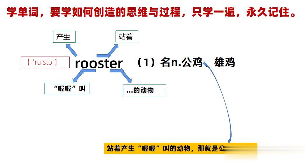 站着产生“喔喔”叫的动物,那就是公鸡、雄鸡!因此我们可以首先写出表示“产生“喔喔”叫”的“roo”,然后用表示“站、站着”的“st”进行补充强调,最后加一个表示“...动物”的“er”即可!详细解说图如下: