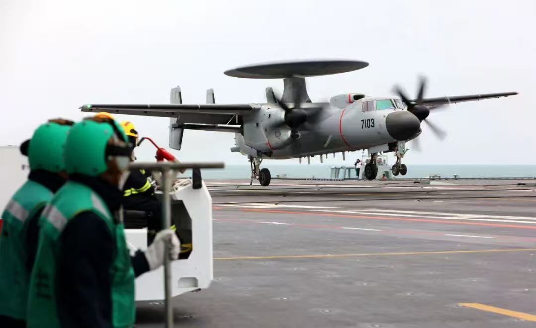 从图片中能够清晰地看到,福建舰甲板上停放着8架固定翼舰载机,有3架空警600(KJ-600)预警机,与E-2“鹰眼”是全球仅有的两款舰载预警机。