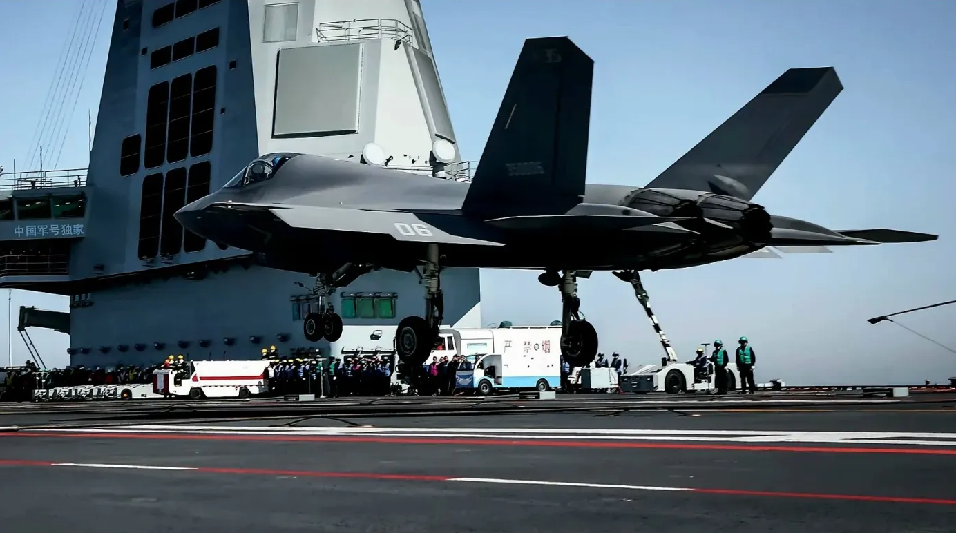 3架歼35(J-35)隐形战斗机,是全球唯一的双发单座隐形舰载战斗机。其航程、雷达尺寸、武器载荷和飞行性能,均远超单发的F-35C联合攻击/战斗机。