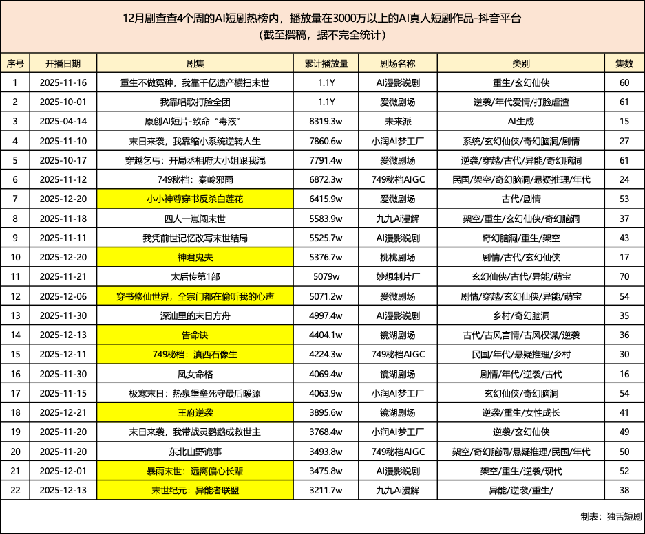 进入12月,这个趋势更加明显。根据剧查查显示,12月4个周,总播放量在3000万以上的AI真人短剧作品为22部,光12月上线的就有8部,占比为36.4%。