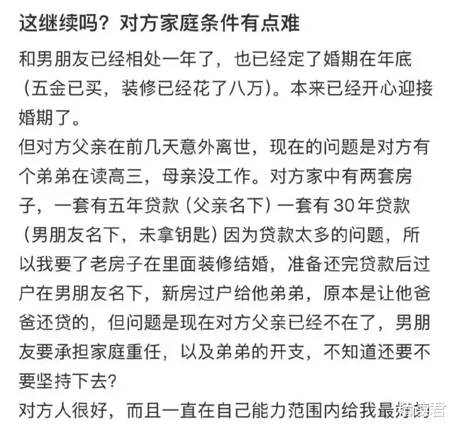 考虑到婚后可能要面临的生活困境:和丈夫一起还两套房子的房贷、供养丈夫的母亲和弟弟……帖主犹豫了,不知这个婚还要不要结。