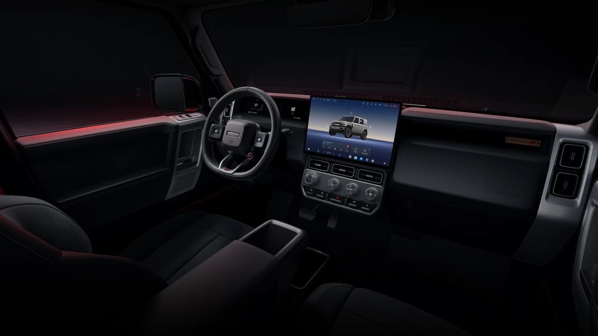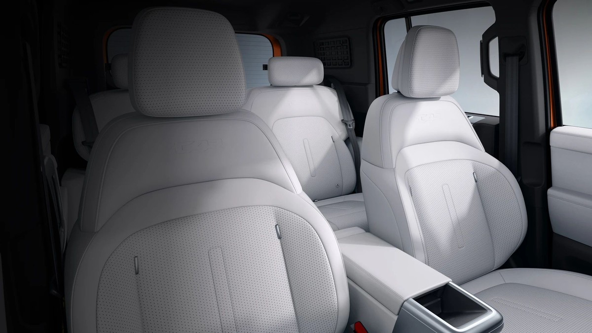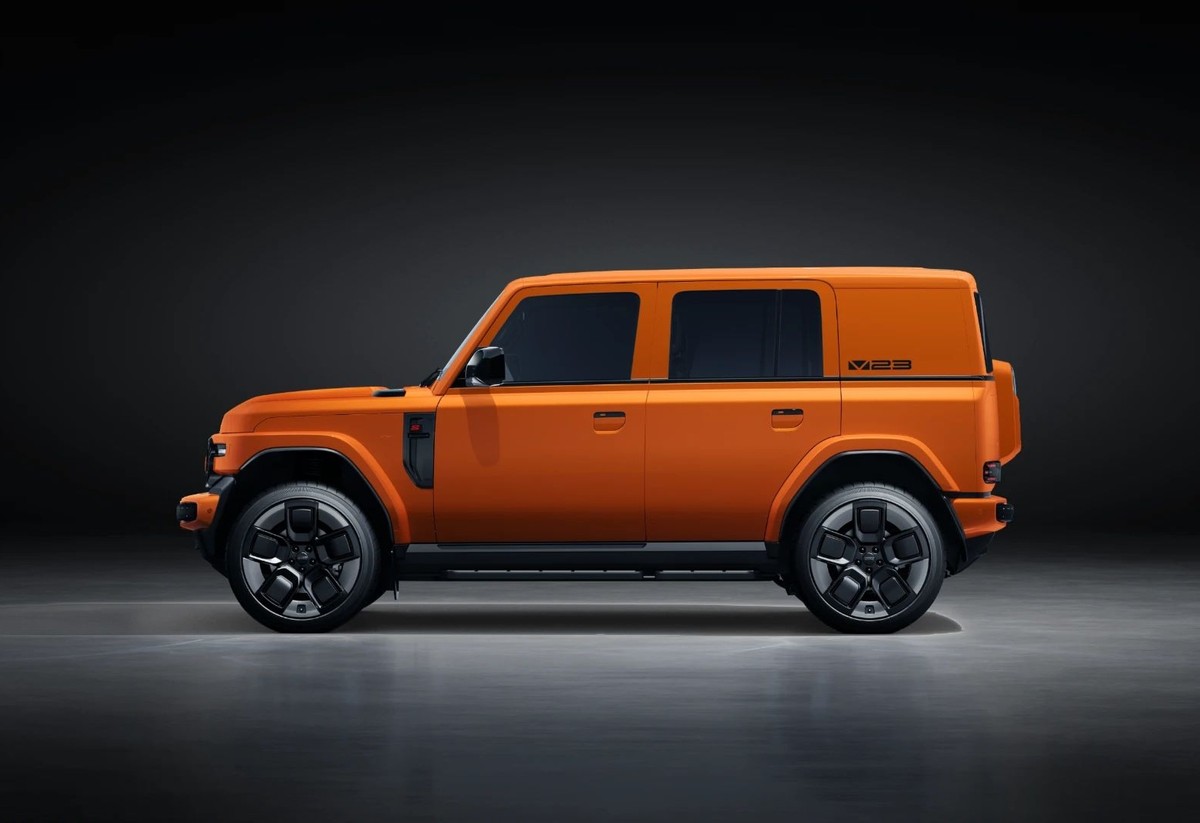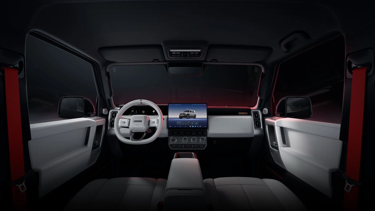 侧面来看,新车采用短车身+长轴距的设计,使其拥有超短的前后悬,不仅大幅提升了通过性,视觉上也更具力量感。此外,新车设计了隐藏式门把手、小书包储物箱和乐高式高位刹车灯,标配19英寸大轮毂和铝合金侧踏板,细节上考虑周到。