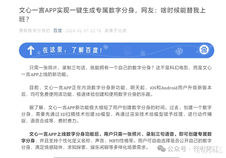 去年11月8日-10日,2023年世界互联网大会乌镇峰会举办。记者从百度获悉,百度首席技术官王海峰在出席前沿数字技术创新与安全论坛和人工智能赋能产业发展论坛时,宣布文心一言自8月31日面向全社会开放至今,用户规模达到7000万,场景4300个,应用2492个。飞桨和文心生态已凝聚800万开发者,服务22万家企事业单位,创建了80万个模型。百度已经与合作伙伴共建了包括能源、金融、航天、制造、传媒、城市、社科以及影视等10余个行业大模型,正加速大模型产业化落地。作为大模型训练的GPU,百度最先从英伟达、AMD购买,受限之后,开始使用寒武纪、华为GPU作为替代。2 月 2 日消息,百度官方公众号发文宣布,文心一言 App 正在内测数字分身新功能。