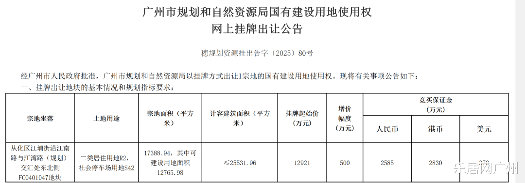 根据公告,这宗地位于从化客运站板块。地块可建设用地面积12765.98㎡,总建面25531.96㎡,起拍总价12921万元,折合起拍楼面价约5060元/㎡。