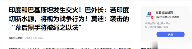 ( 信息来源:每日经济新闻 2025年04月25日 —— 印度和巴基斯坦发生交火!巴外长:若印度切断水源,将视为战争行为!莫迪:袭击的“幕后黑手将被绳之以法” )