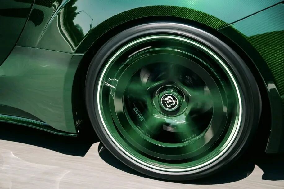 这台巴博斯的内饰和它的外观一样狂野。座舱内几乎每一寸地方都被绿色皮革和绿色Alcantara材质覆盖,包括座椅、传动通道、门板、车顶内衬和脚垫。少数没有用皮革或Alcantara包裹的部件,则采用了绿色碳纤维饰面。
