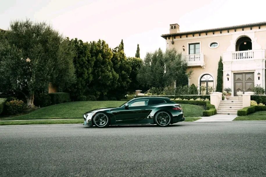 在阳光下,绿色的碳纤维看起来非常漂亮,不过肯定有人会觉得它过于张扬。重新设计的车尾和加长的车顶线条也注定会引发分歧,不过,我觉得猎装车的处理手法和SL的车身线条意外地很契合。