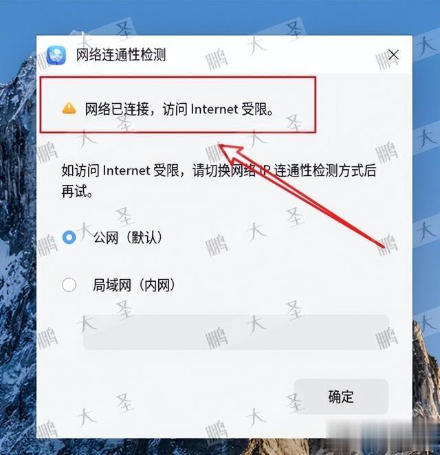 系统自动联网检测显示“Internet 受限”;