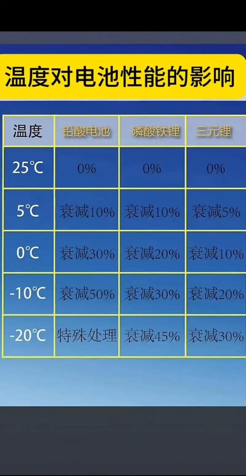 低温表现好:新款电池具备加热系统,消耗5%的电量在5分钟以内可以将电池升温到25°,是电池最适宜的工作温度,确保电池在-20°的环境下容量保持在85%,有效解决电池冬季续航缩水的痛点。而普通铅酸电池0°容量衰减30%,-10°容量衰减过半,-20°已经不能正常充放电了。