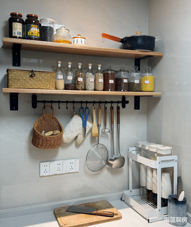 3、经常使用的调料架,安装在灶台一侧或顺手的区域,不常用的东西,可以安装在闲置区域。