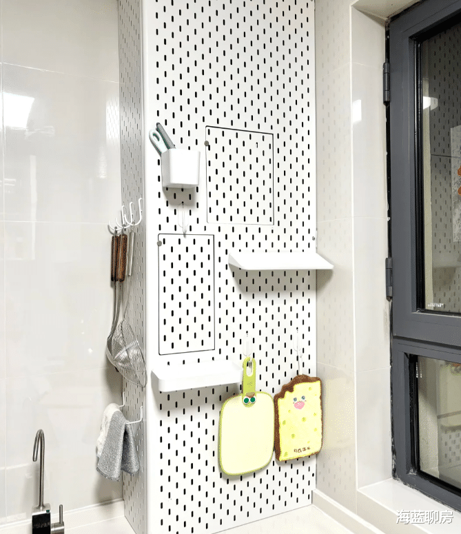 可以装上挂钩挂厨具,也可以固定置物架、置物盒放调料、锅盖。像很多厨房的台面上有管道露出,或者是为了遮丑,做了一个直角墙,这种位置最适合装洞洞板,安装后遮丑又实用。