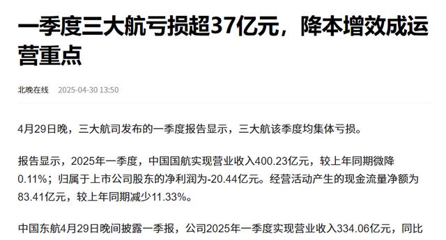 北晚在线:一季度三大航亏损超37亿元,降本增效成运营重点