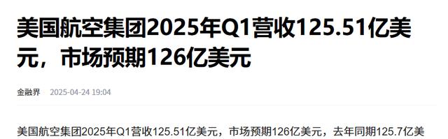金融界:美国航空集团2025年Q1营收125.51亿美元,市场预期126亿美元