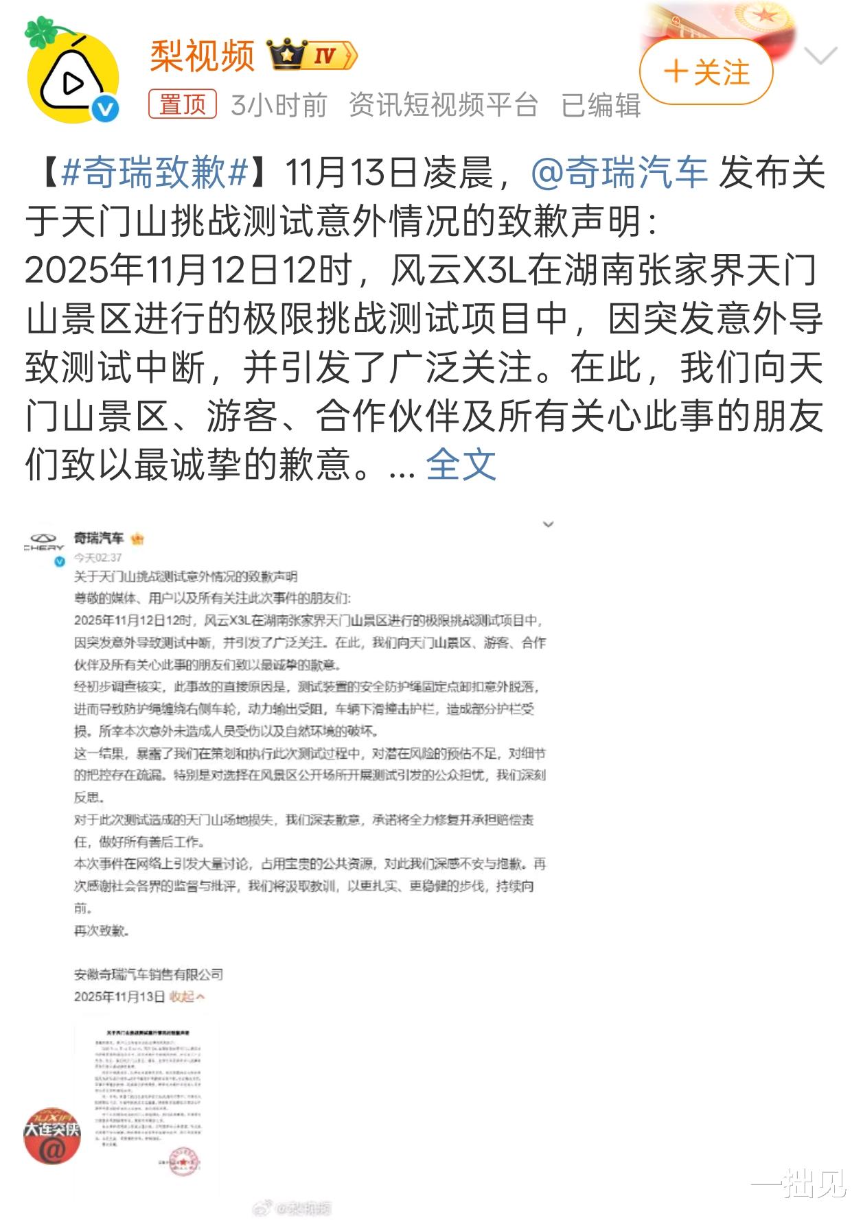 很显然,奇瑞这是吃饱了撑的没事干,非得折腾自己,可为何非得选在天门山天梯里测试呢?一点意义都没有。
