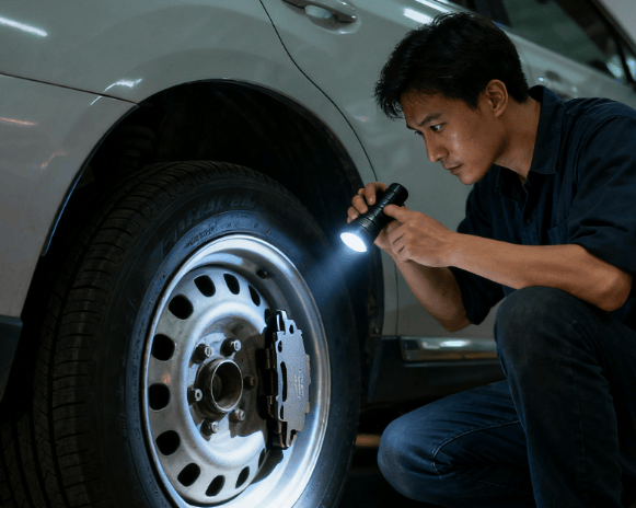 再说说自己能不能判断刹车片厚度,这事儿我还真试过。有次保养完没俩月,总觉得心里不踏实,就想自己看看。其实不用拆轮子,你蹲在车轱辘旁边,从轮毂的缝隙里往里头看,就能着见刹车片 —— 就是夹在刹车盘两边,有点像钢板似的东西。我当时看的时候,眯着眼睛瞅了半天,才勉强看清,感觉厚度还行,心里才踏实点。不过要是轮毂设计得比较严实,缝隙小,那可能就不太好瞅了,我家另一辆车就是这样,咋看都看不清,最后还是开车去修理店,让师傅用手电筒照了一下才知道。