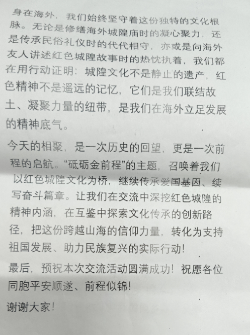 今日相聚,是历史的回望,更是前程的启航。“砥砺前程”的主题,召唤我们以红色城隍文化为桥,继续传承爱国基因、续写奋斗篇章。让我们在交流中深挖红色城隍的精神内涵,在互鉴中探索文化传承的创新路径,将这份跨越山海的信仰力量,转化为支持祖国发展、助力民族复兴的实际行动!