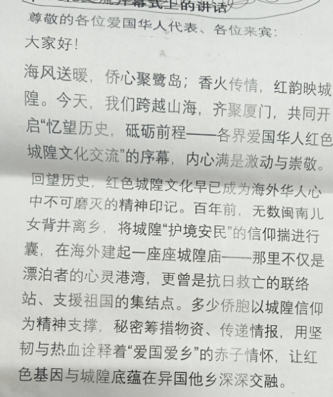 海风送暖,侨心聚鹭岛;香火传情,红韵映城隍。今天,我们跨越山海,齐聚厦门,共同开启“忆望历史·砥砺前程——各界爱国华人红色城隍文化交流”的序幕,内心满怀激动与崇敬。