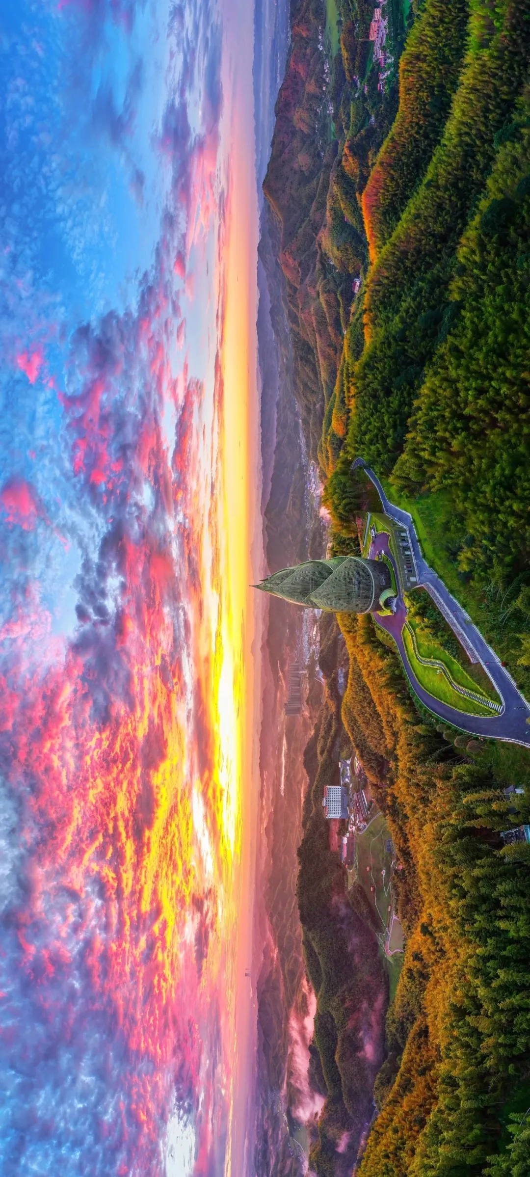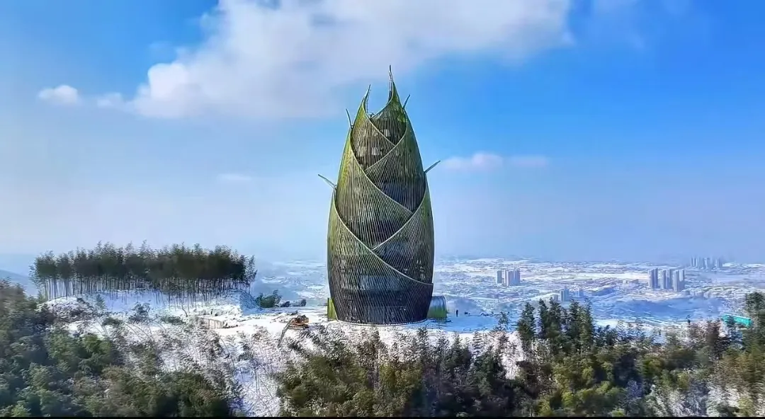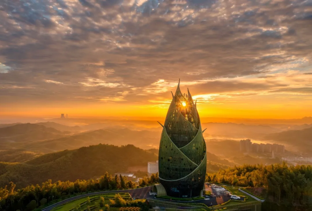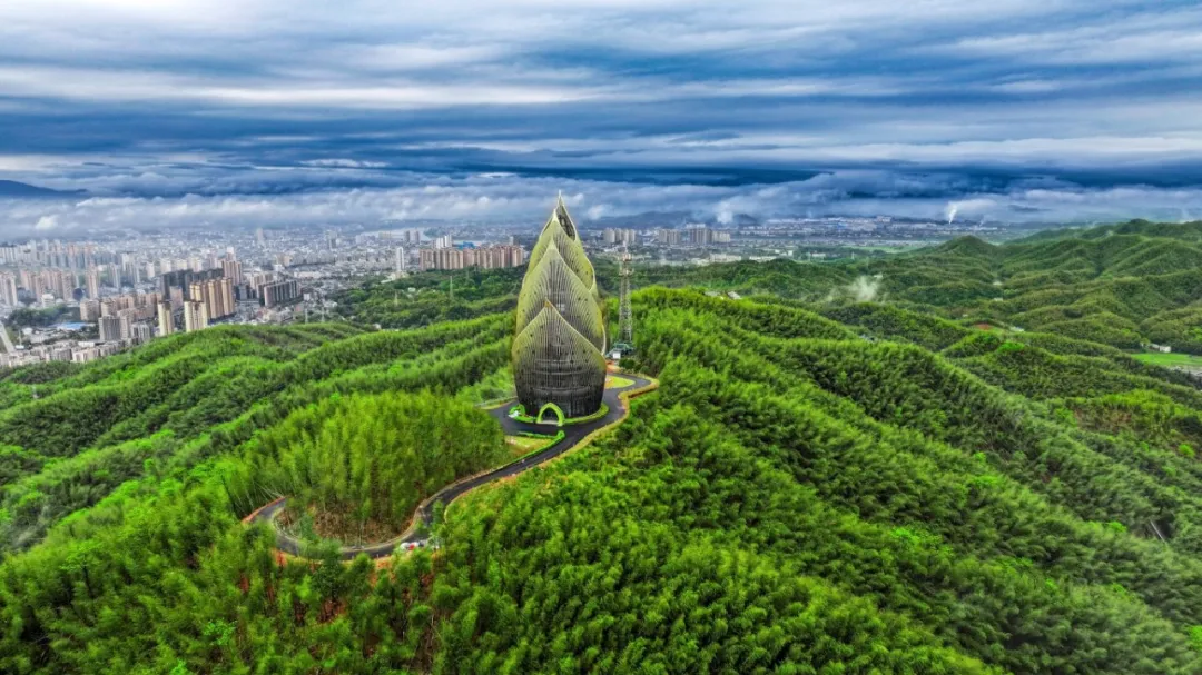 最让人惊喜的是景区制高点上形似大竹笋的“竹海揽翠”观景塔。这座高56.95米的笋形建筑不仅是森林防火瞭望的“守护者”,更是绝佳的观景平台。登上塔顶,极目远眺,连绵起伏的万亩竹海尽收眼底,竹浪翻涌,翠色如潮。恰如李白的《夜宿山寺》中所描绘的一样,“不敢高声语,恐惊天上人。或者,生怕惊扰了这片宁静。
