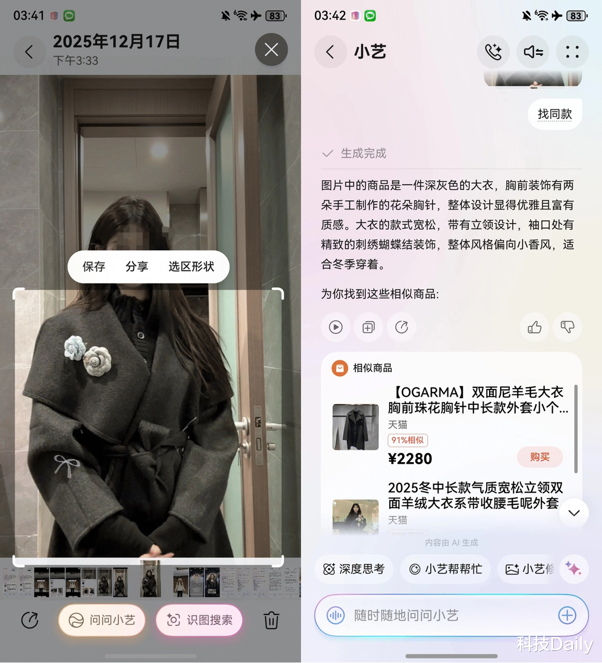 观看盛典时看到明星穿了好看的衣服,自己非常喜欢,可以直接用指关节圈选衣服,然后“问问小艺”,点击“找同款”,小艺就能全网搜索同款,快速找到相似的商品链接,省去打开APP搜索的麻烦。