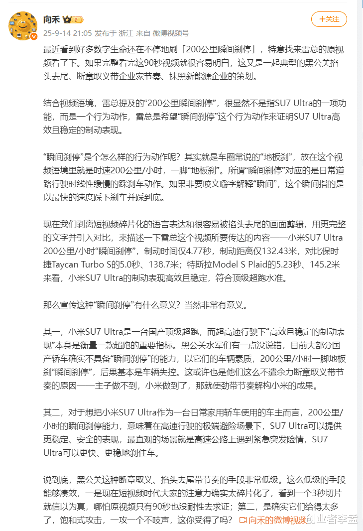 不过被人诟病的并不是小米汽车的“瞬间刹停”,而是雷军开着小米SU7 ultra汽车的时候,在封闭路段测试汽车的刹停时间的测试视频被人掐头去尾的剪辑了,然后形成的一种宣传方式!然后就带动了一群专门为了“黑”,和不明真相的人,可能认为是事实,然后被带节奏了!