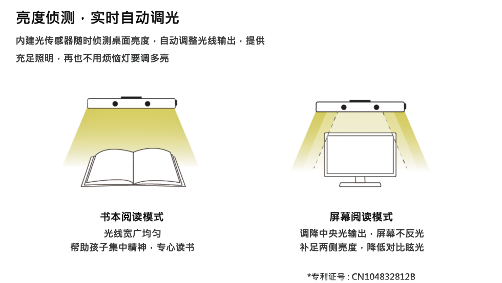 ▼开启屏幕模式时,调降中央光输出,屏幕不反光,补足两侧亮度,降低对比眩光,搭配暖白光,更适合孩子居家上网课等屏幕使用。如果觉得暗还可以通过右侧旋钮进行手动调节。