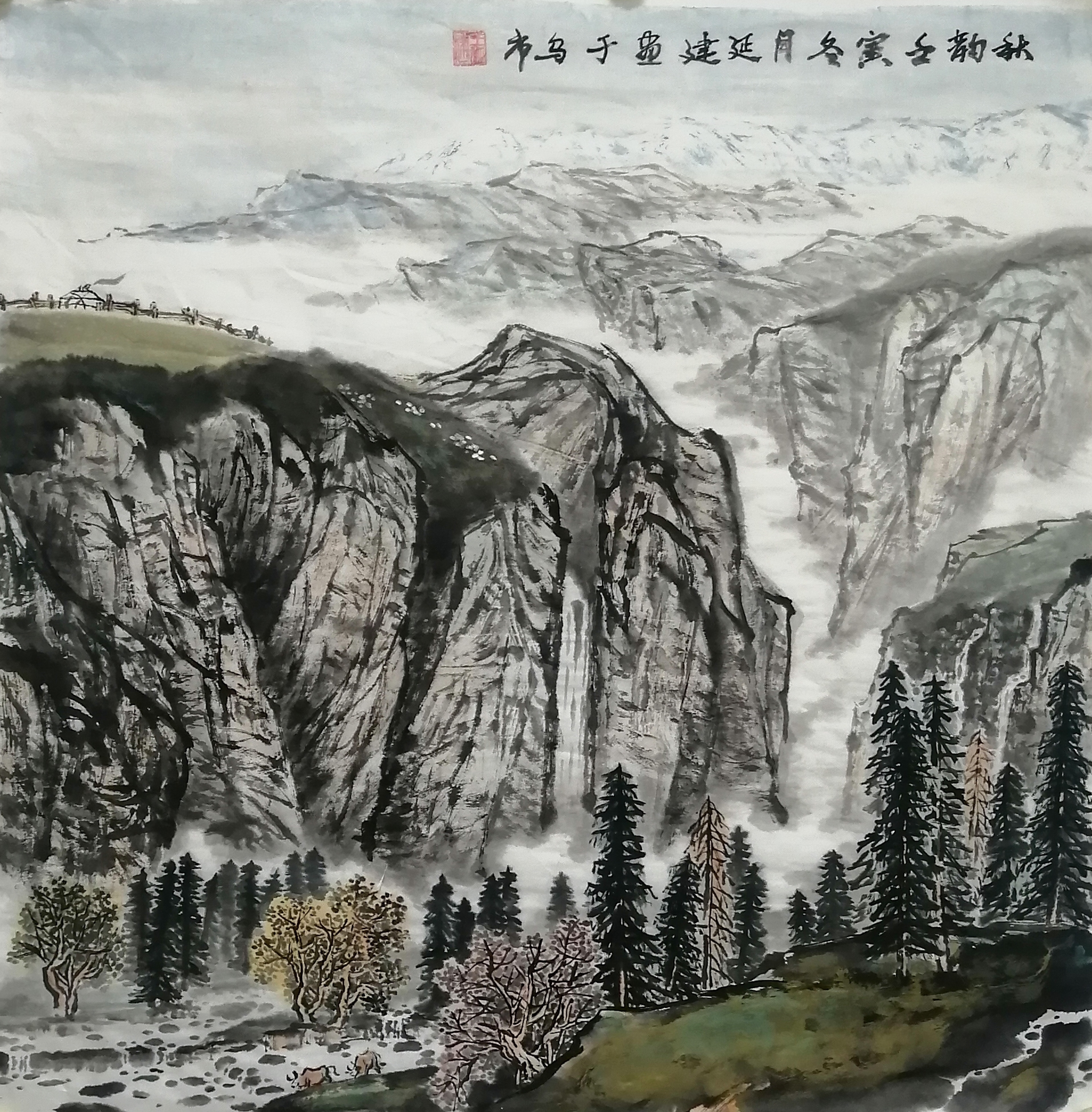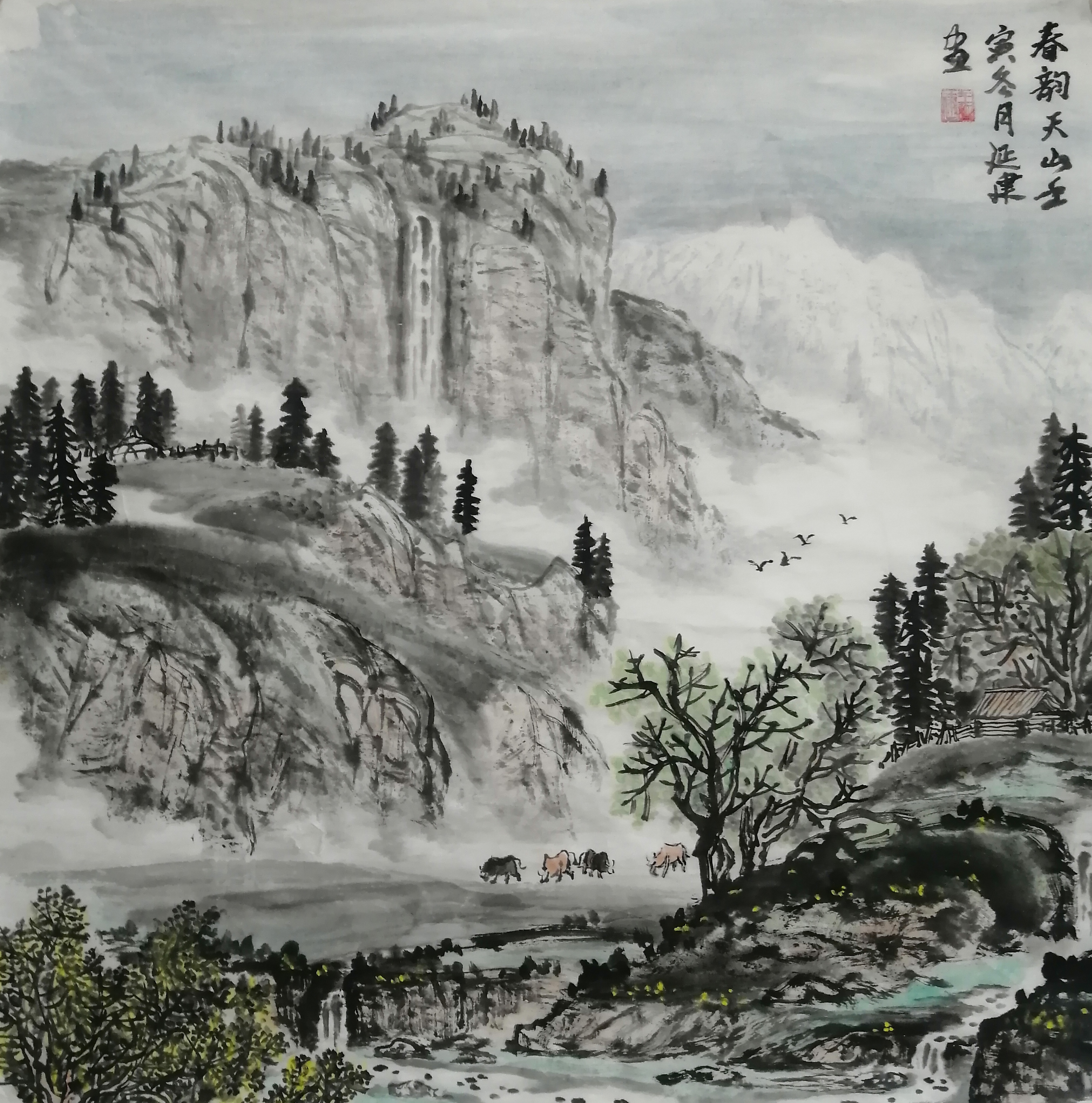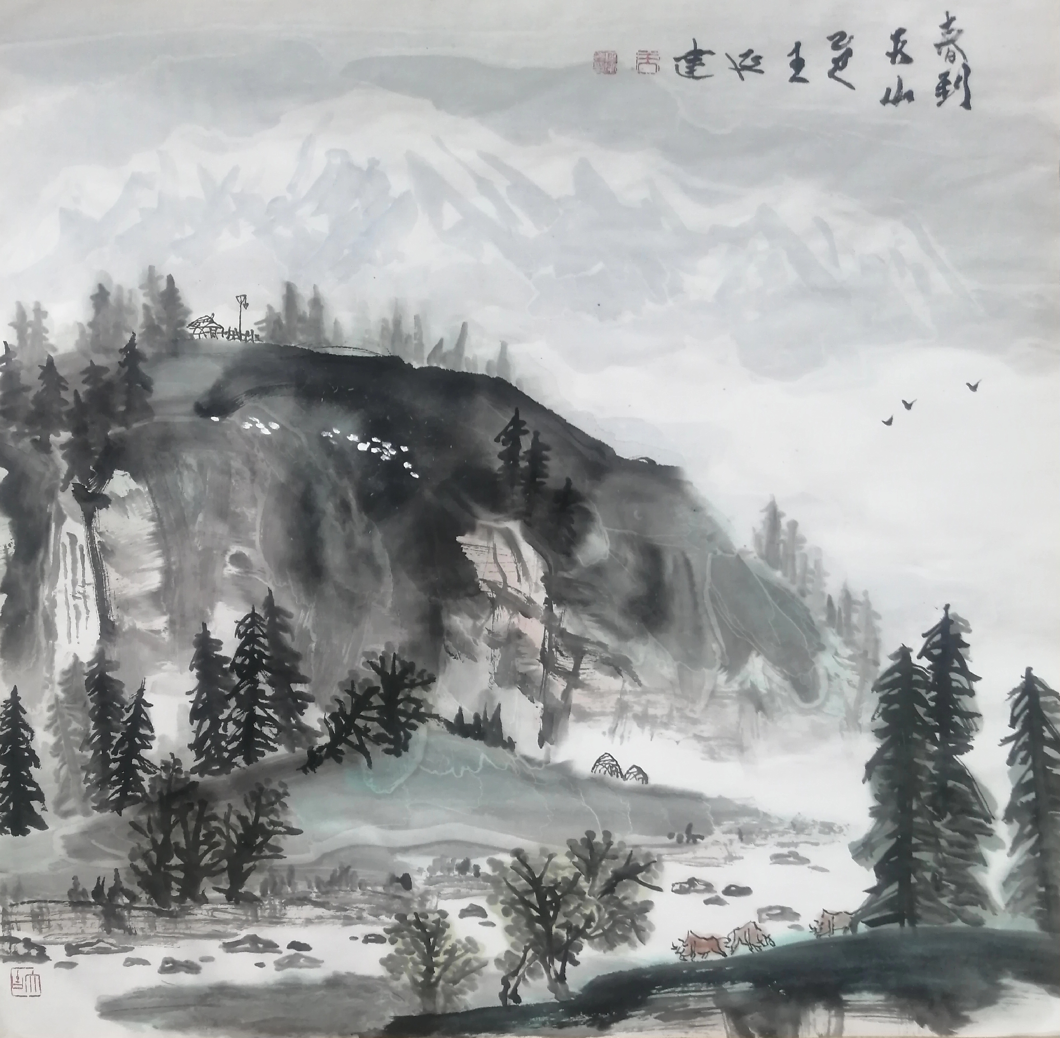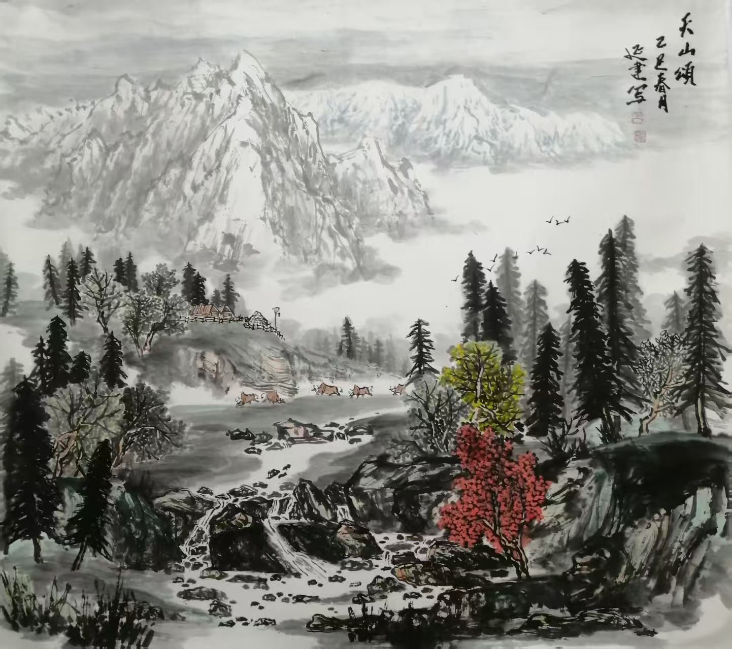 他潜心钻研历代名家的笔墨心法,从范宽的雄峻、郭熙的灵动中汲取营养,又结合新疆山水的地域特色不断探索创新。他将传统笔墨的苍劲洒脱与西域山水的雄浑壮阔相融合,逐渐形成了笔墨厚重、意境深远、地域特色鲜明的艺术风格。其笔下的山石多用斧劈皴、披麻皴,线条遒劲有力,墨色层次丰富;树木勾勒简练传神,疏密有致;云水灵动飘逸,虚实相生,既展现了传统国画的艺术魅力,又凸显了新疆山水的独特风骨。