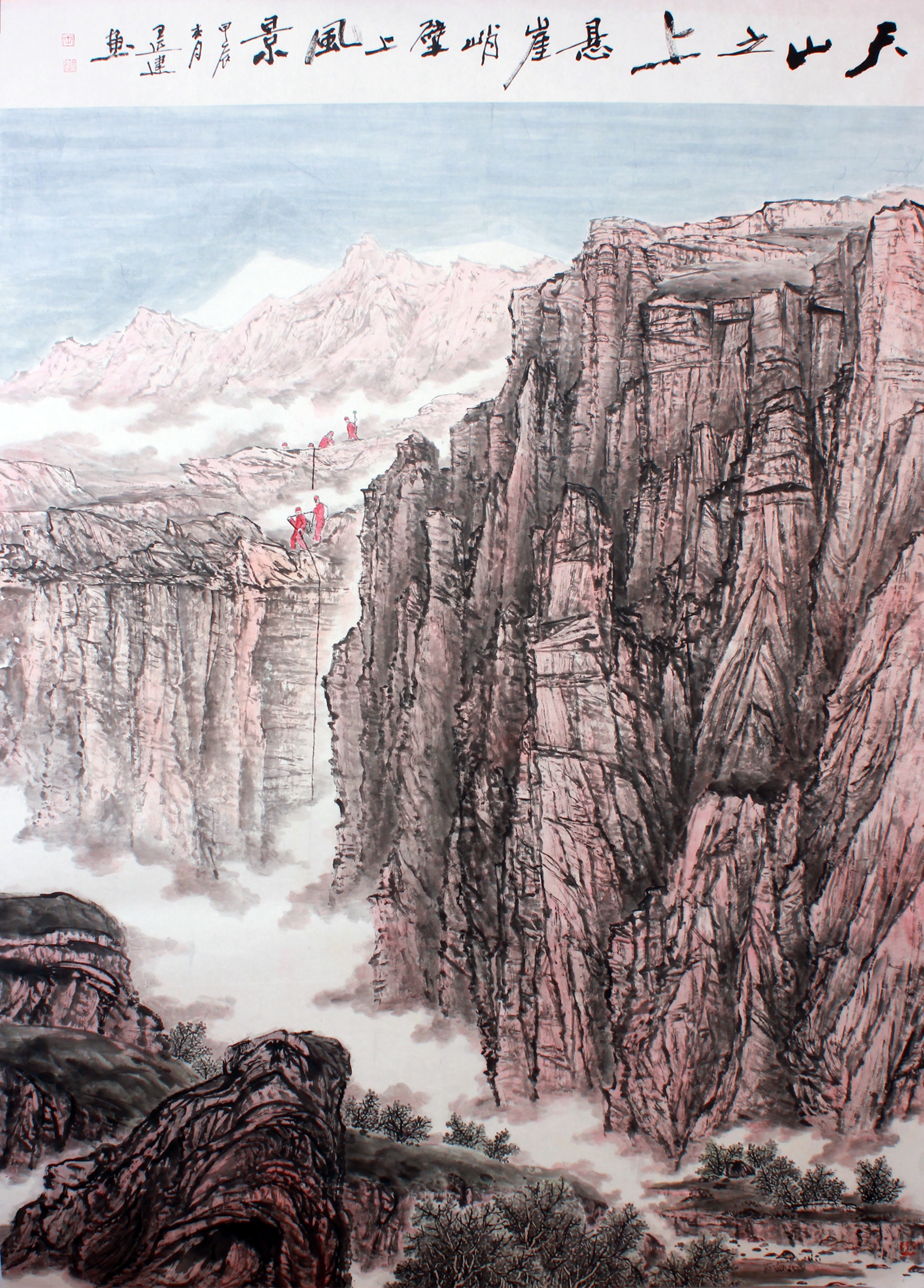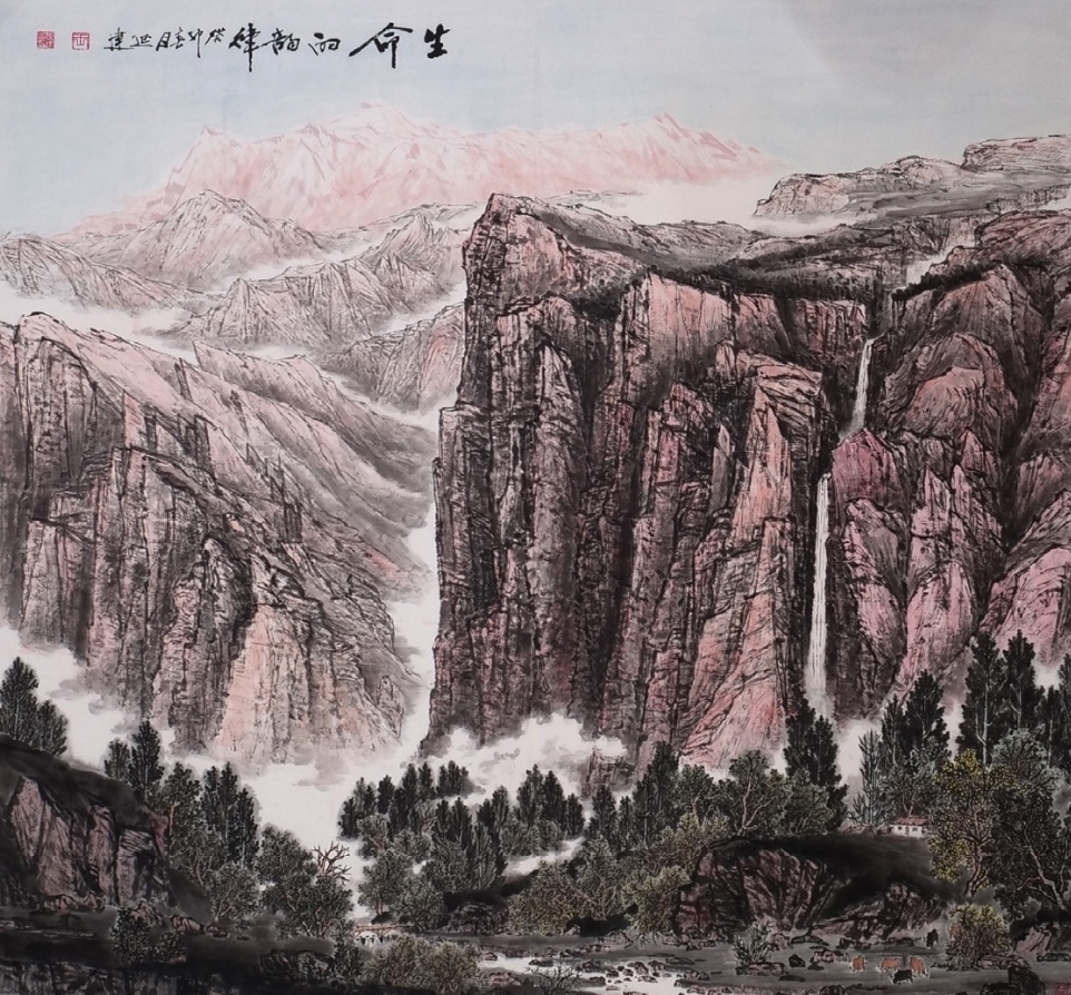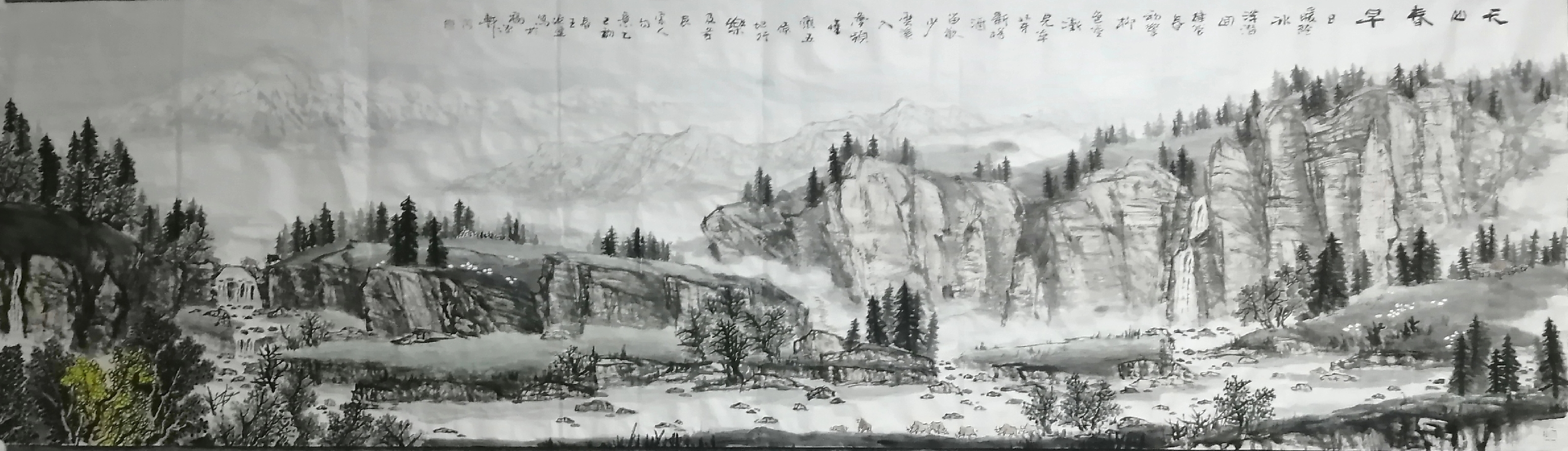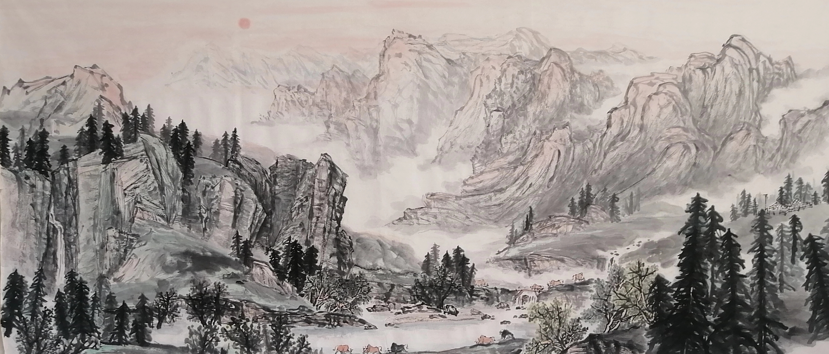 他潜心钻研历代名家的笔墨心法,从范宽的雄峻、郭熙的灵动中汲取营养,又结合新疆山水的地域特色不断探索创新。他将传统笔墨的苍劲洒脱与西域山水的雄浑壮阔相融合,逐渐形成了笔墨厚重、意境深远、地域特色鲜明的艺术风格。其笔下的山石多用斧劈皴、披麻皴,线条遒劲有力,墨色层次丰富;树木勾勒简练传神,疏密有致;云水灵动飘逸,虚实相生,既展现了传统国画的艺术魅力,又凸显了新疆山水的独特风骨。