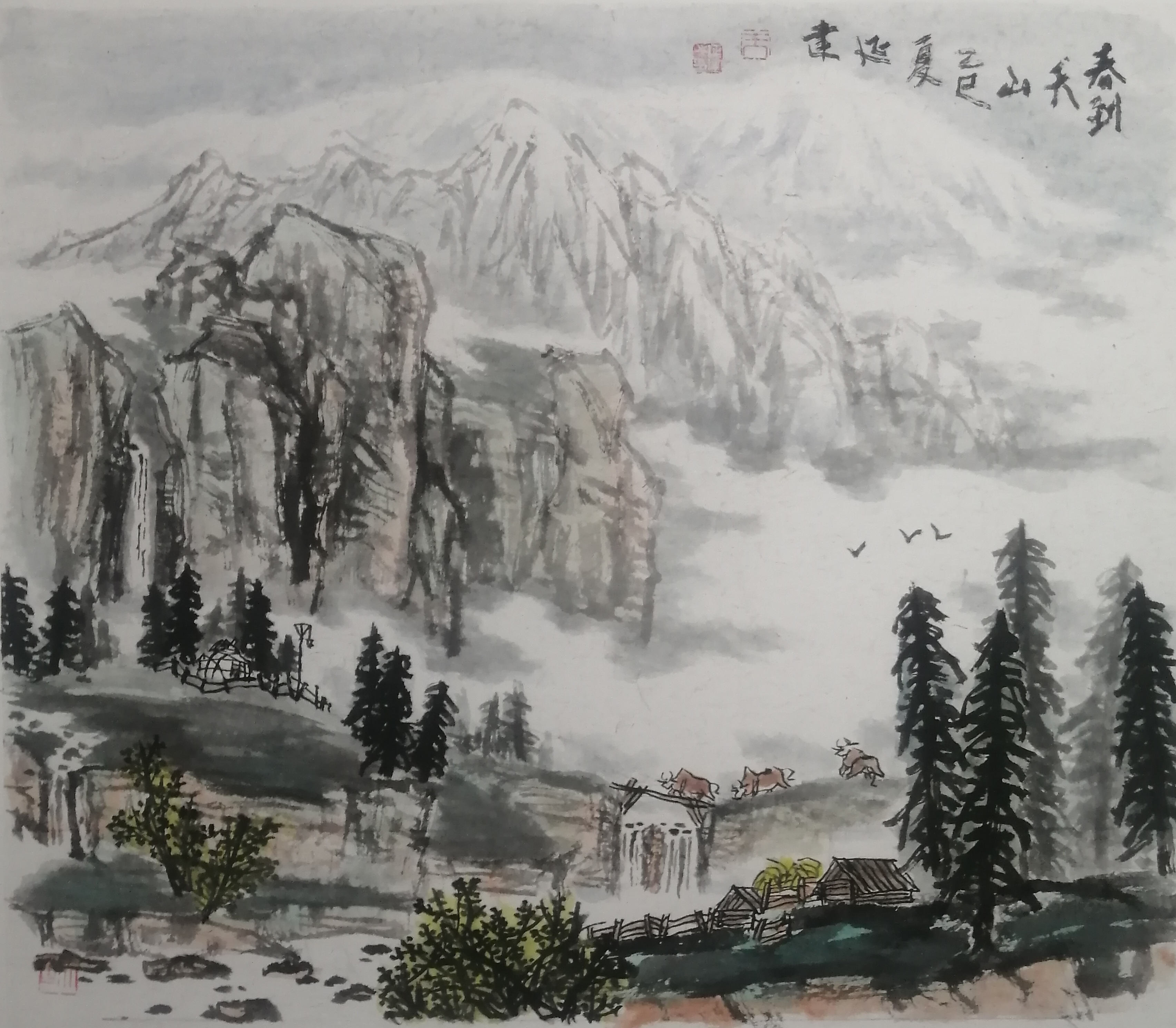 2022年,是他创作成果颇丰的一年:作品《天山下的家园》入选新疆美协“梦冰雪·文润青河——‘狼山杯’新疆中国画展”,画作以温暖的笔触描绘了天山脚下家园的宁静祥和,雪山、草原、毡房构成一幅和谐共生的美好图景,传递出浓厚的生活气息;同年,作品《丹霞春韵》入选新疆美协“桑皮纸上的中国画作品展”,他巧妙运用桑皮纸独特的质感,以绚丽而不艳俗的色彩、灵动而不失沉稳的笔墨,展现了新疆丹霞地貌的神奇与壮美,让观者仿佛身临其境。