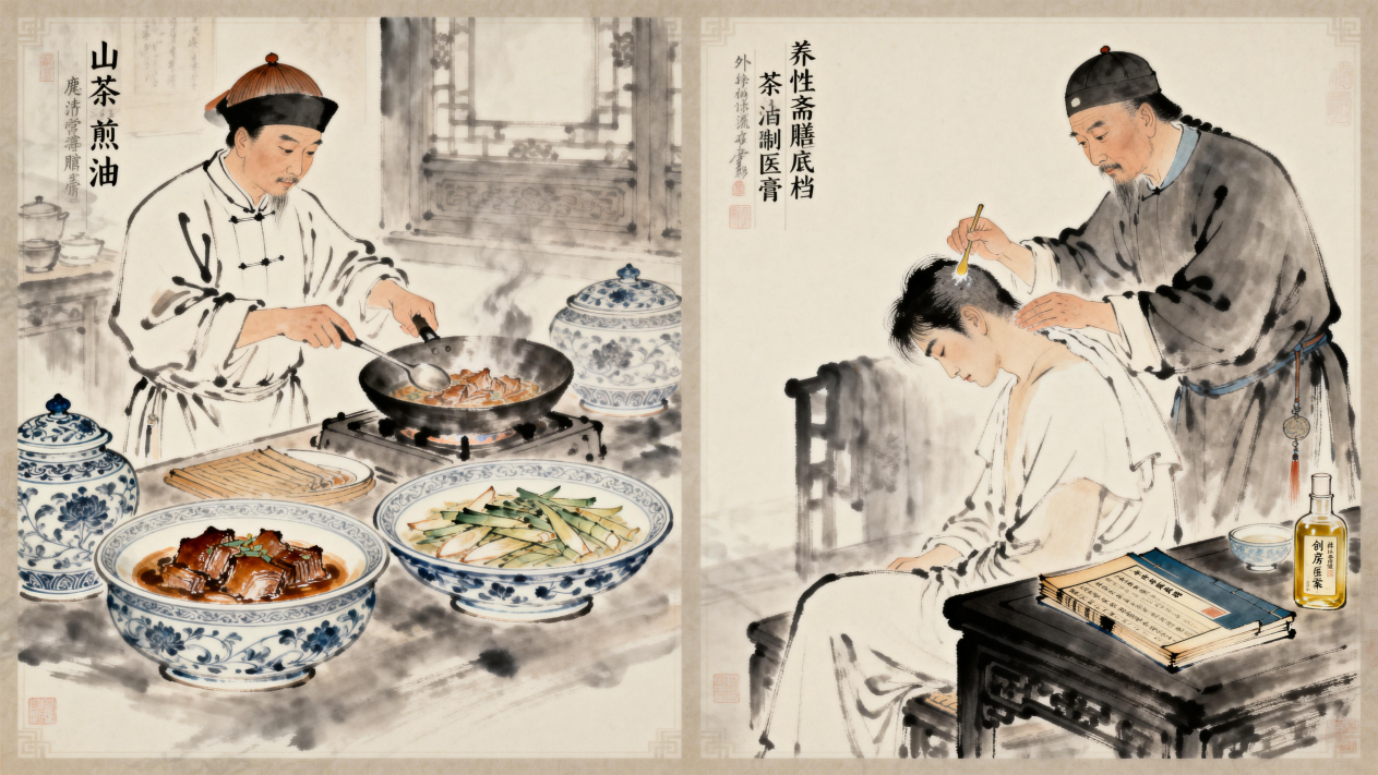 清宫内务府档案中亦载有“茶油煮药膳”“茶油润发方”等记录。例如乾隆二十八年(1763)《御药房医案》中有“茶油调药服以养肝血”“茶油外涂头皮以光发”之记载,显示其在食疗与日常保养中的双重地位。