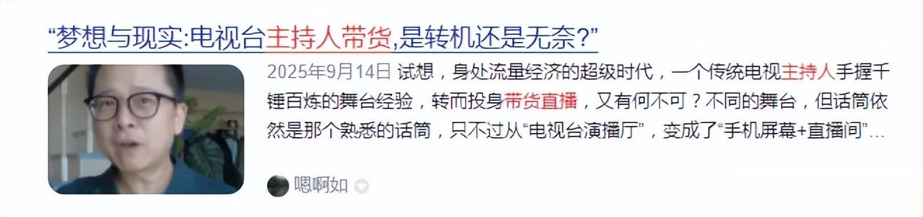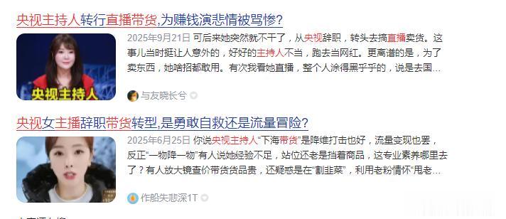 其实,作为公众人物,这些话题和热议早已在互联网搜索时代被网友“刨根问底”到毫无新鲜感。加之,近年来,在职主持人频繁选择直播带货赛道的现象,与本职业务背道而驰,令主持人在大众心里平添了些许的负面口碑。而选择离职冲向带货直播的前主持人们,又被猜疑赚的盆满钵满。