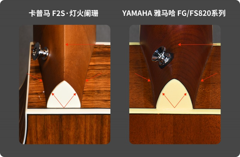 卡普马F2S镶嵌材料为红花梨实木镶嵌,雅马哈FG/FS820系列为经典ABS镶嵌。