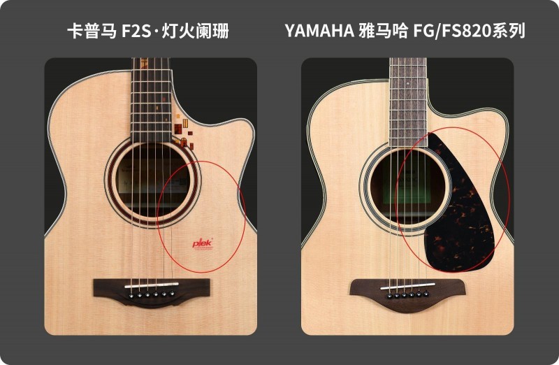 卡普马F2S采用的是进口透明护板,雅马哈FG/FS820采用的是经典玳瑁色护板