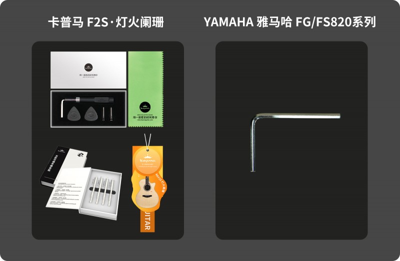 卡普马F2S因为标配了“五阶可调手感系统”,所以有五个不同高度的下枕,雅马哈FG/FS820标配一个琴枕,官方公布的弦高是1.8-2.6mm