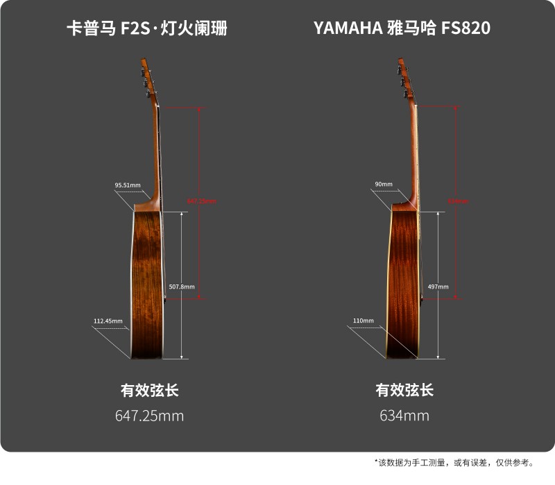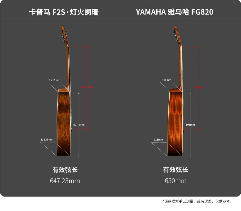 理论上更薄的漆面能释放更佳共鸣,卡普马F2S漆面平均厚度控制在0.18mm以内,而雅马哈FG/FS820系列的实测数据约为0.25mm。相较于大部分吉他0.30-0.48mm的油漆厚度,F2S和FG/FS820属于相对较薄的油漆。